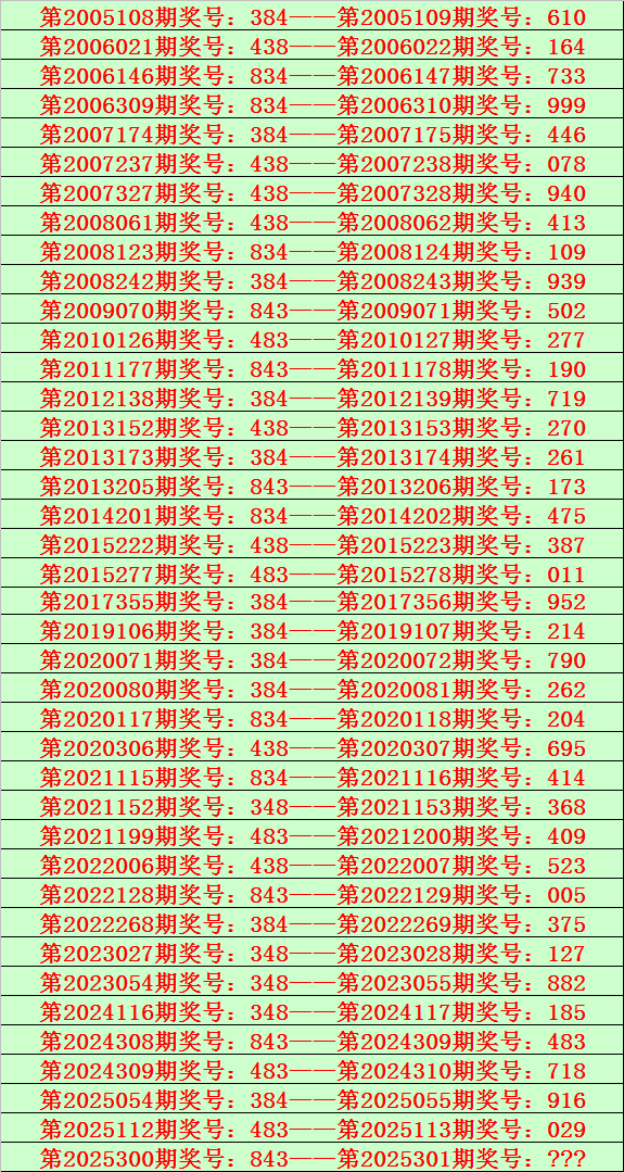 排列三第2025301期开奖日期:2025年11月11日,历史上第301期已开出了20次奖号,历年同期号码分别为:635、199、824、020、224、356、641、579、376、524、449、888、616、901、379、418、622、181、041、877。